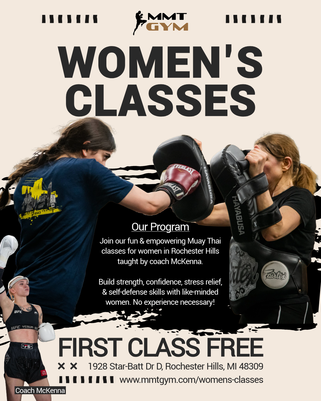 Join our fun & empowering Muay Thai classes for women taught by Coach McKenna, all in a safe, structured, and supportive environment.